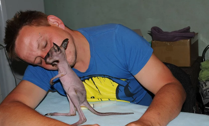 Przerażona matka wyrzuciła małego Plastusia z torby. Zginąłby, gdyby jego rodzicami nie zostali ludzie. Kangurzątko dostaje teraz mleko dla psów i dojrzewa w sztucznej torbie, specjalnie dla niego uszytej…